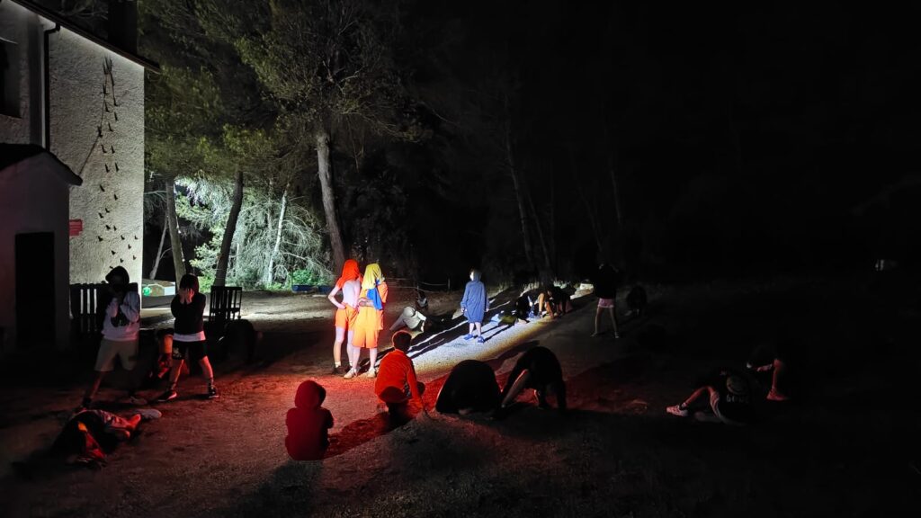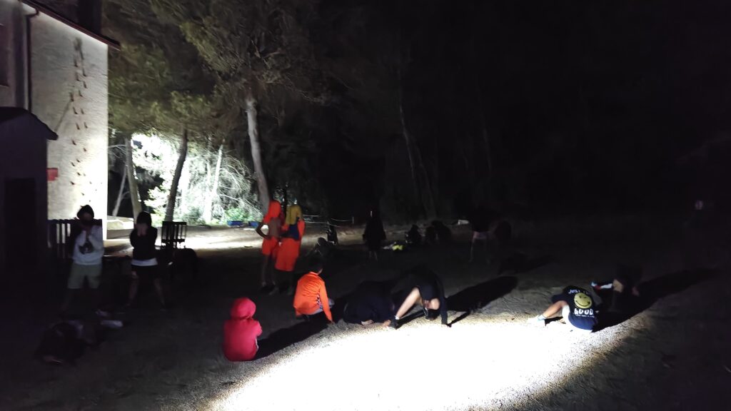 El juego nocturno que hemos desarrollado hoy ha sido «el linternazo»: un escondite al revés. Los compañerxs que la ligaban, tenían que adivinar quienes éramos apuntándonos con las linternas (no ha sido nada sencillo ya que nos hemos tapado bien para que no nos reconociesen e incluso nos hemos intercambiado algo de ropa para despistar). Lo hemos pasado en grande, y esto no ha hecho nada más que empezar.