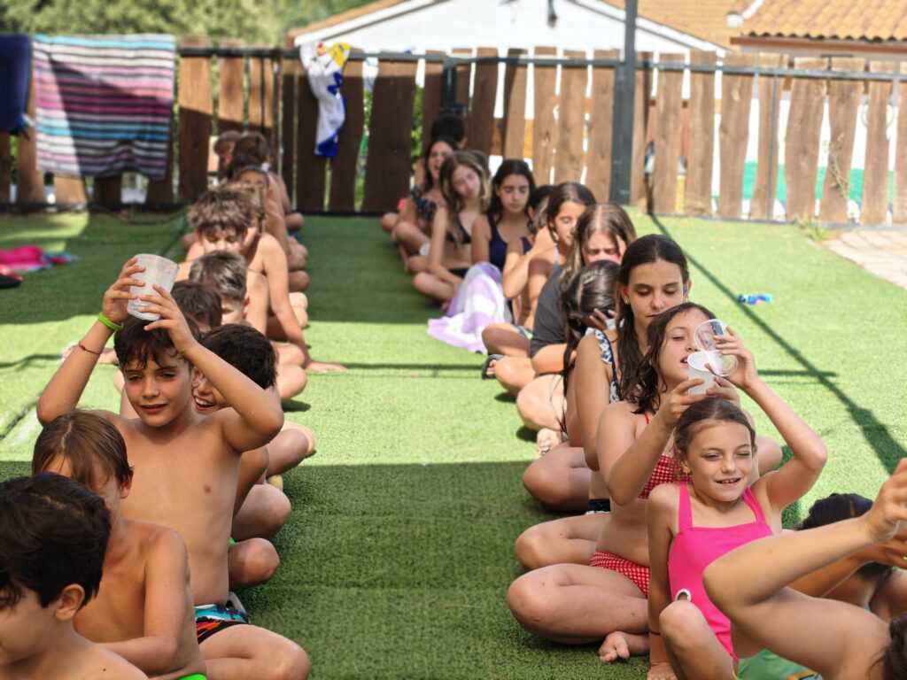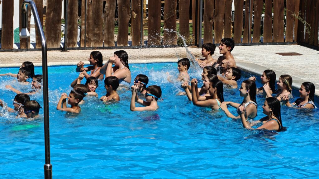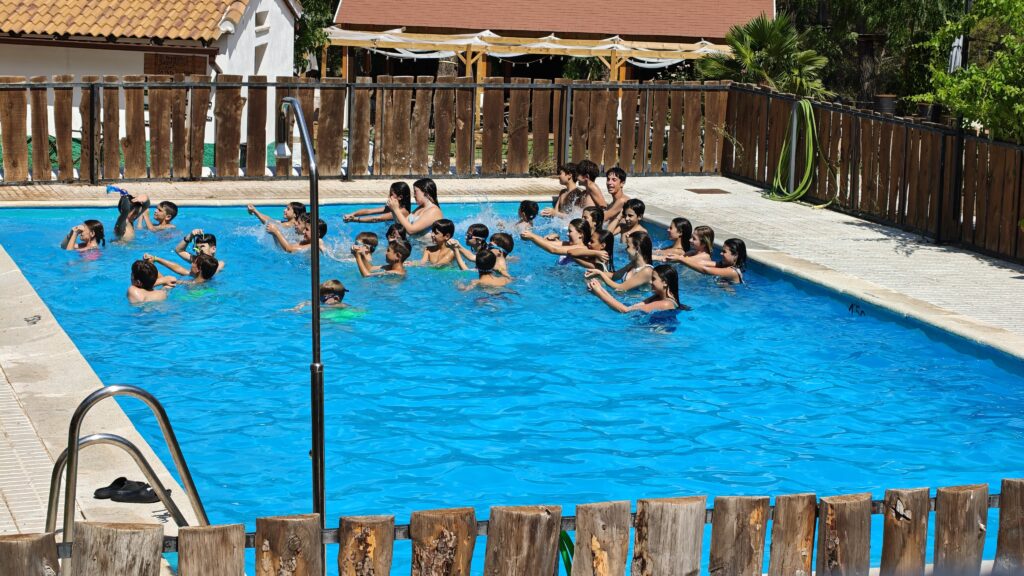 Después de comer hemos tenido tiempo libre en la piscina, enlazando con la primera actividad de la tarde que ha sido…juegos de pisicina! un poco de aquagym, concurso de saltos, relevos… pero sobre todo y los más importante, siempre bien refrescados.